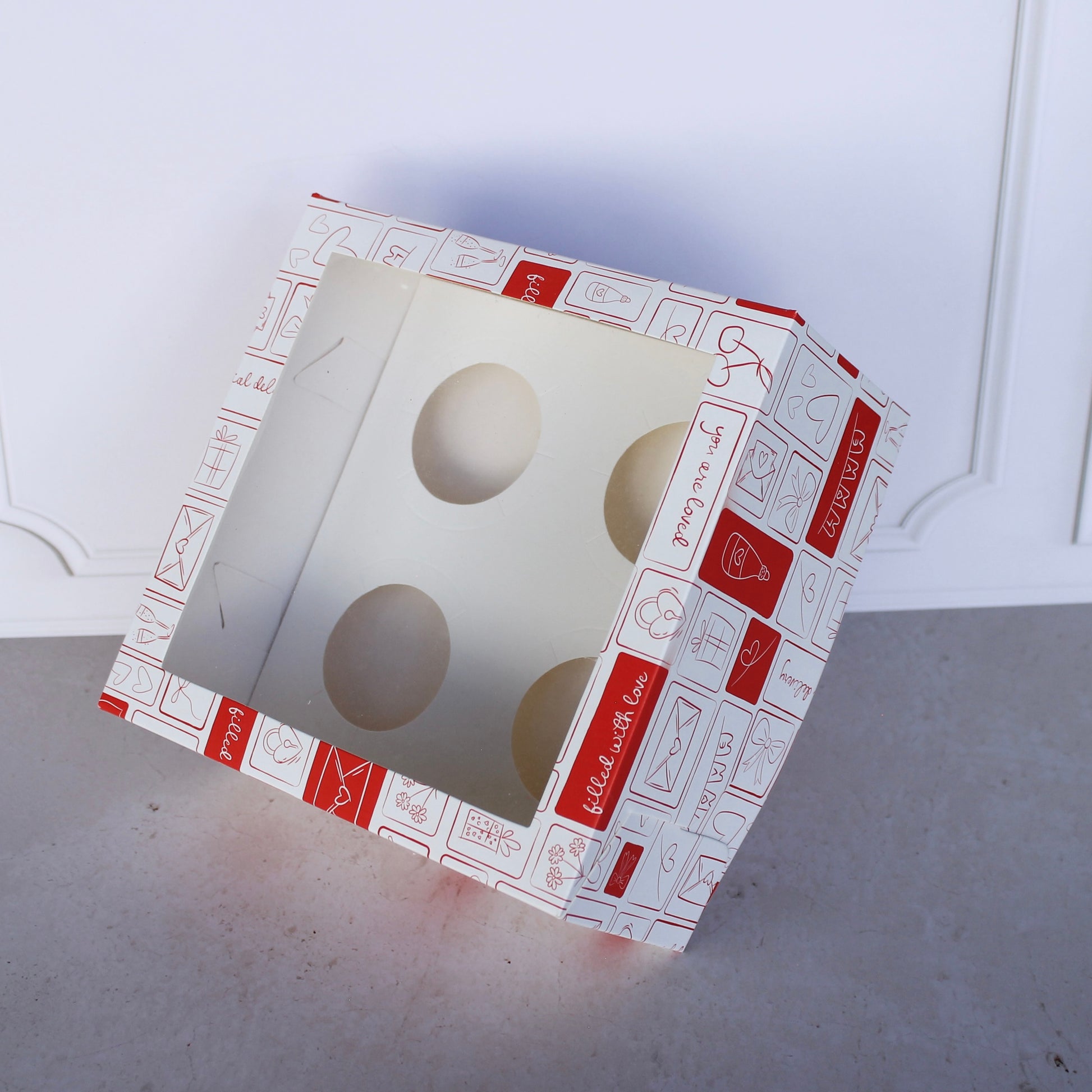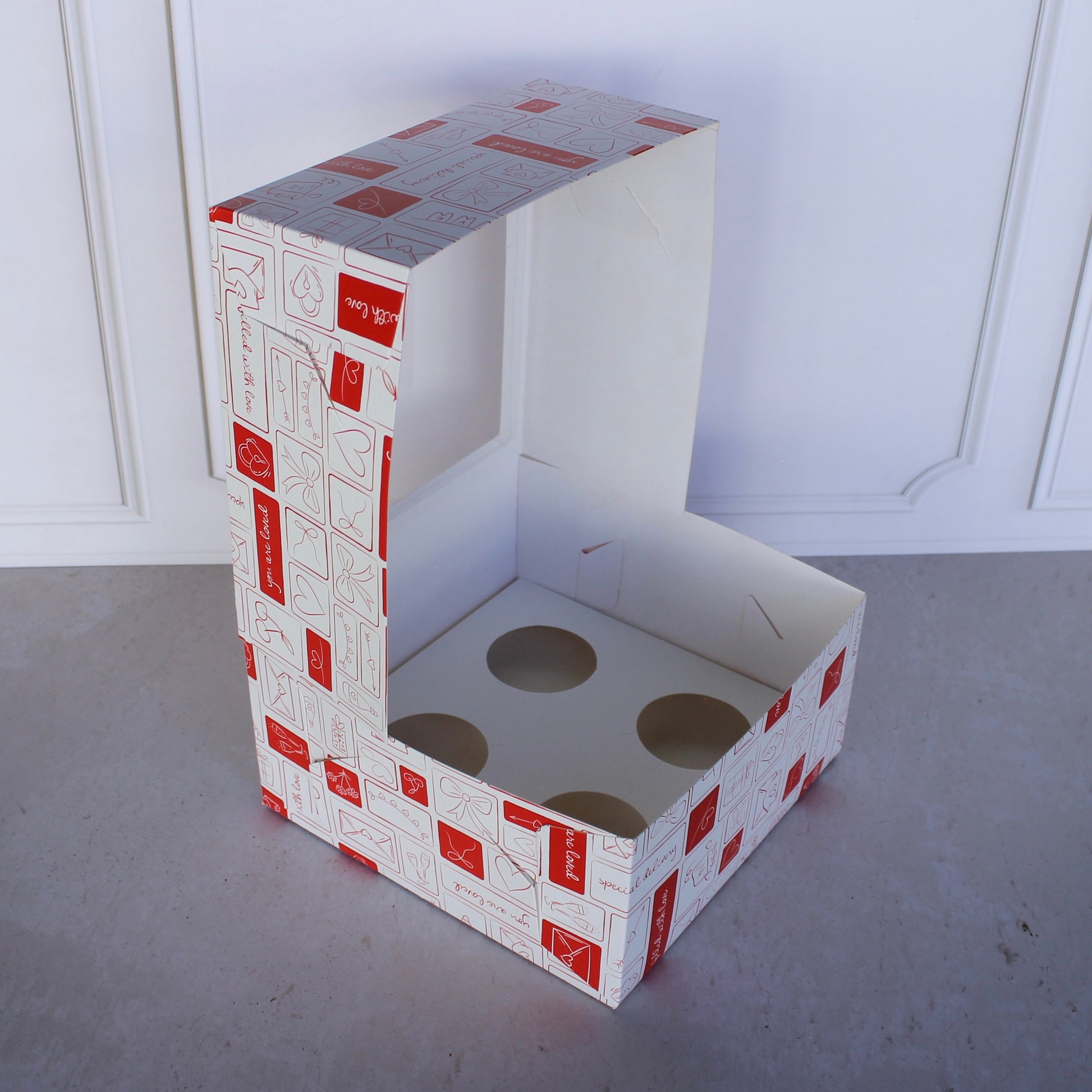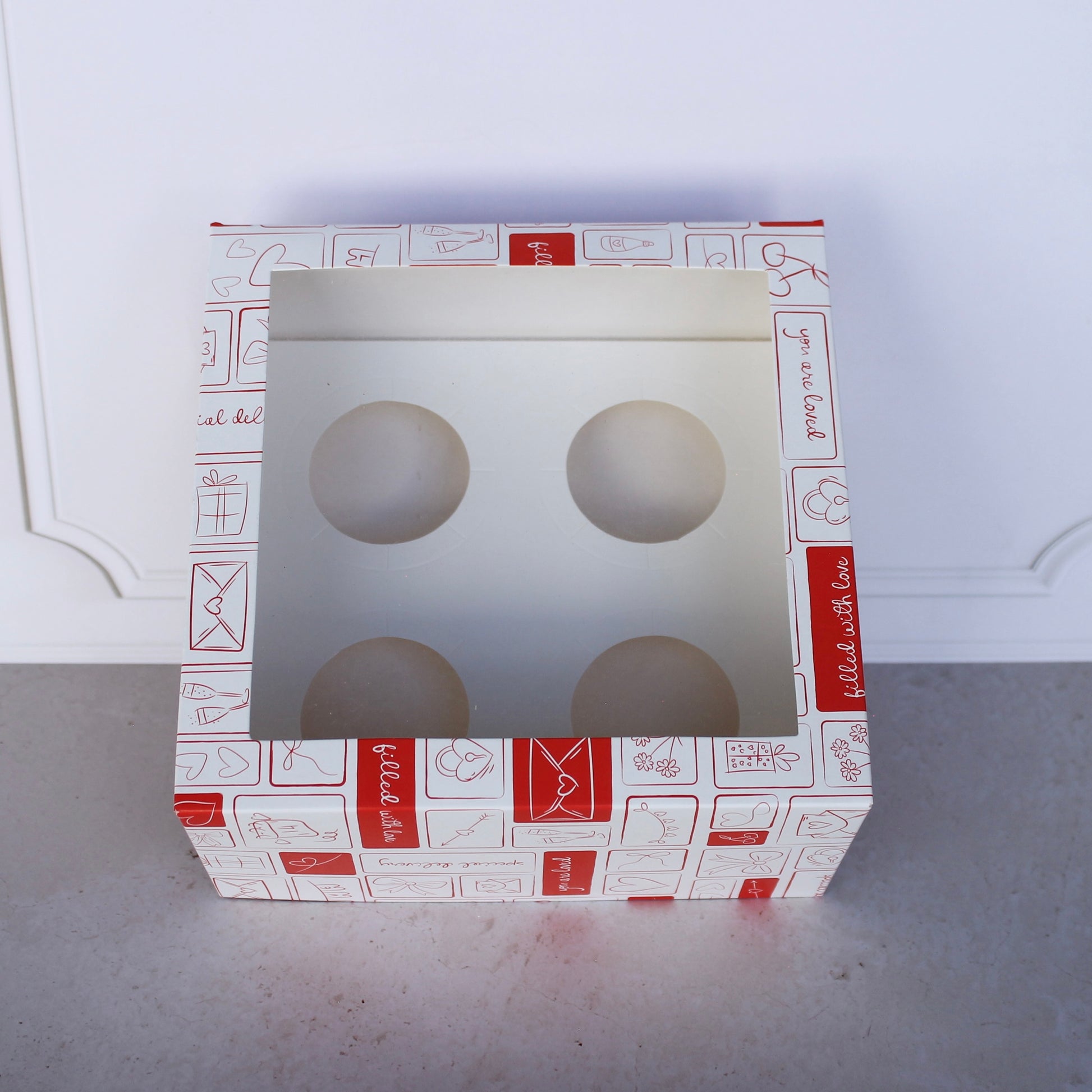 - Caja auto armable, no requiere de pegamento para su armado. Recomendada para empacar y exhibir 4 cupcakes/quequitos. También puede funcionar para otro tipo de productos como panes o galletas removiendo el inserto.