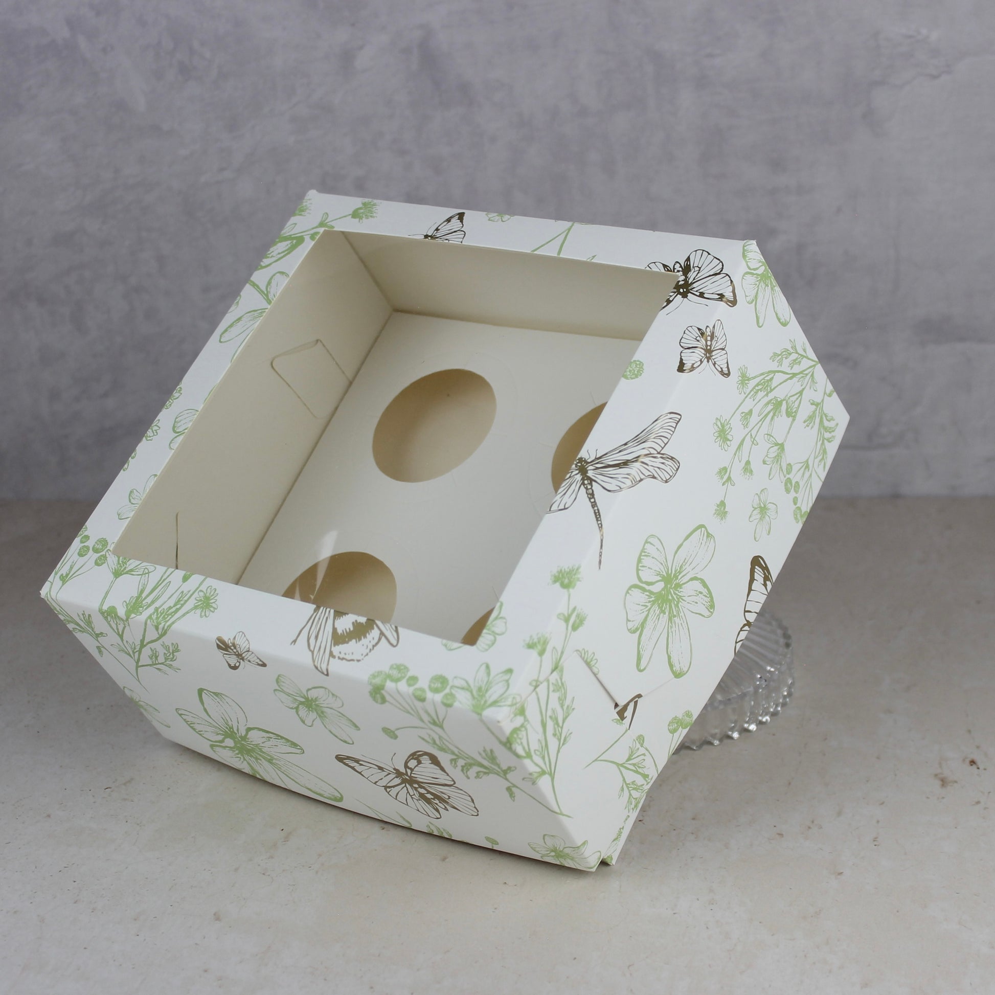 - Medidas: 19.5x19.5x9.5 CM (Largo x Ancho x Alto) con inserto de 4 cavidades para cupcakes.