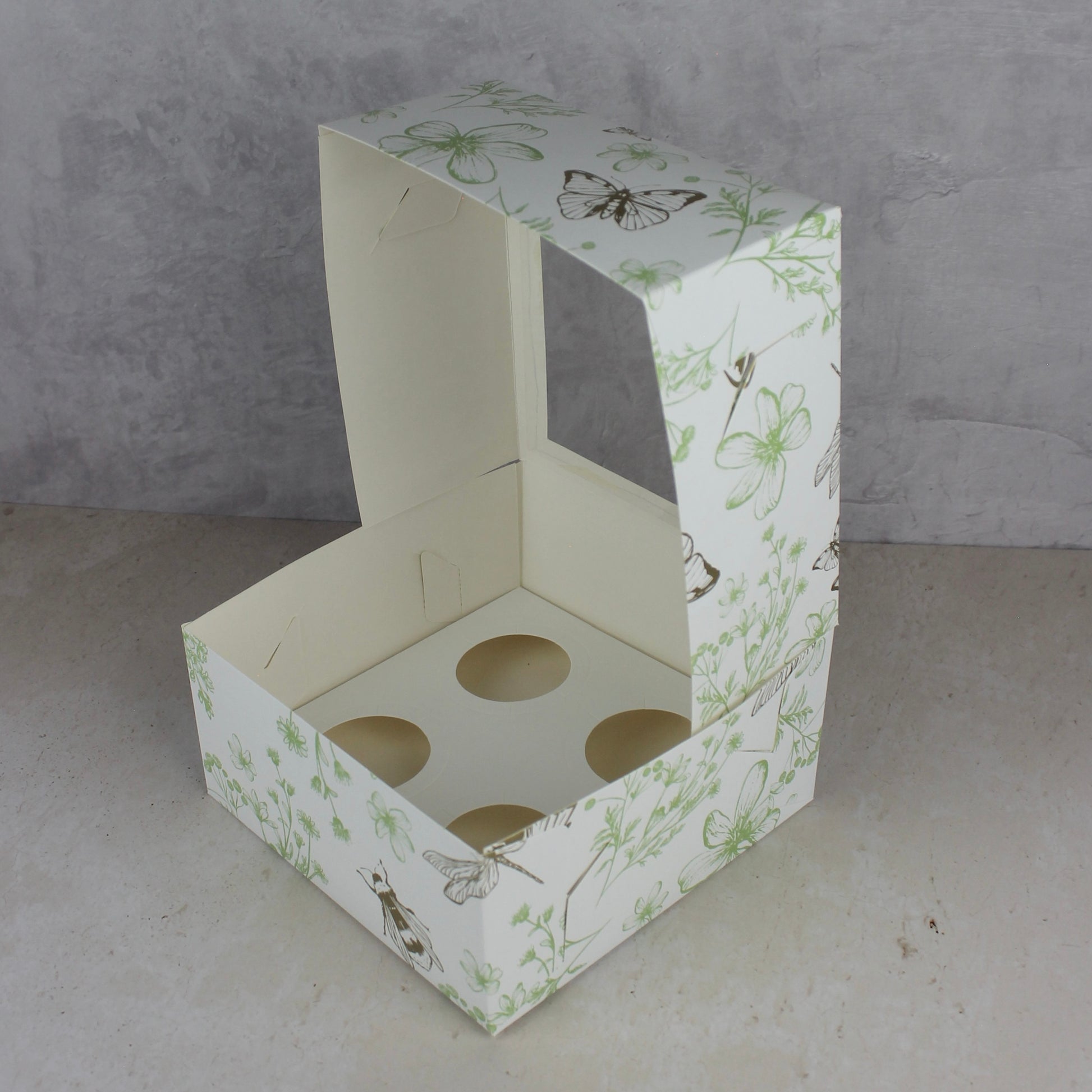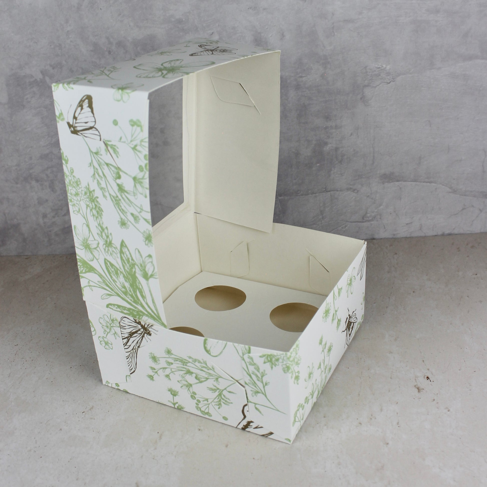 - Caja auto armable, no requiere de pegamento para su armado. Recomendada para empacar 4 cupcakes o quequitos.