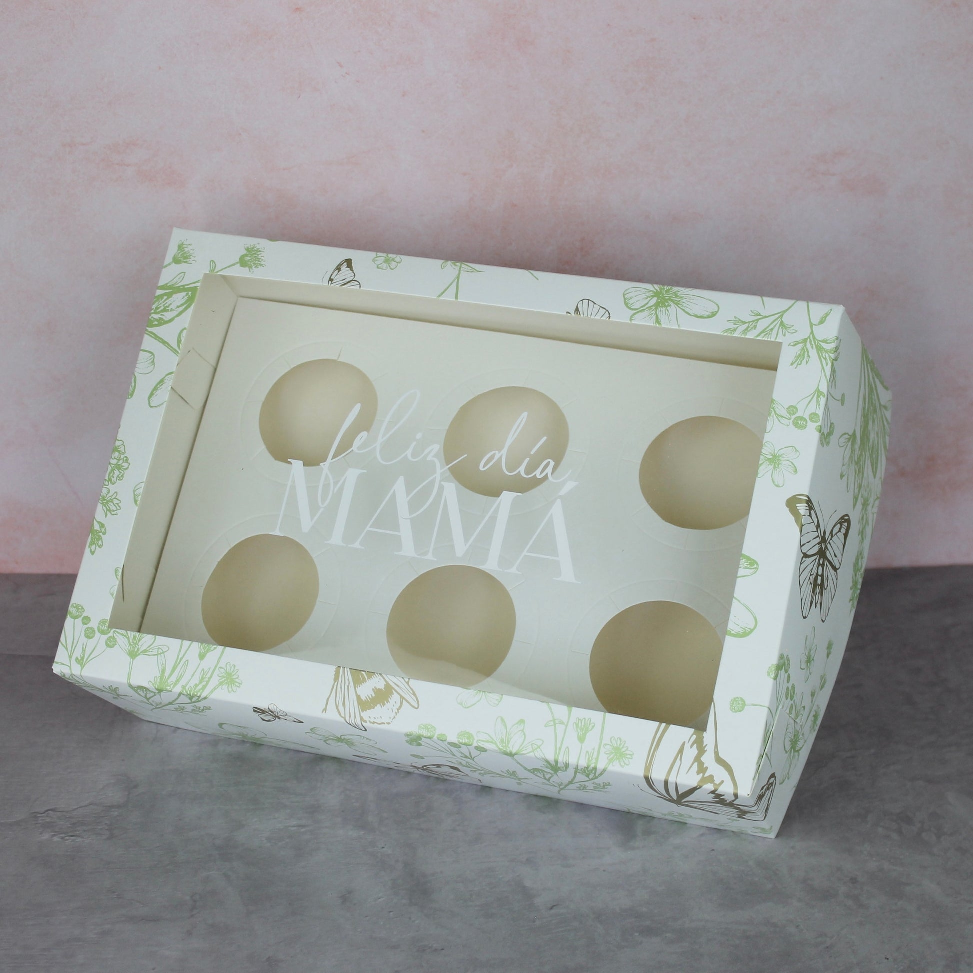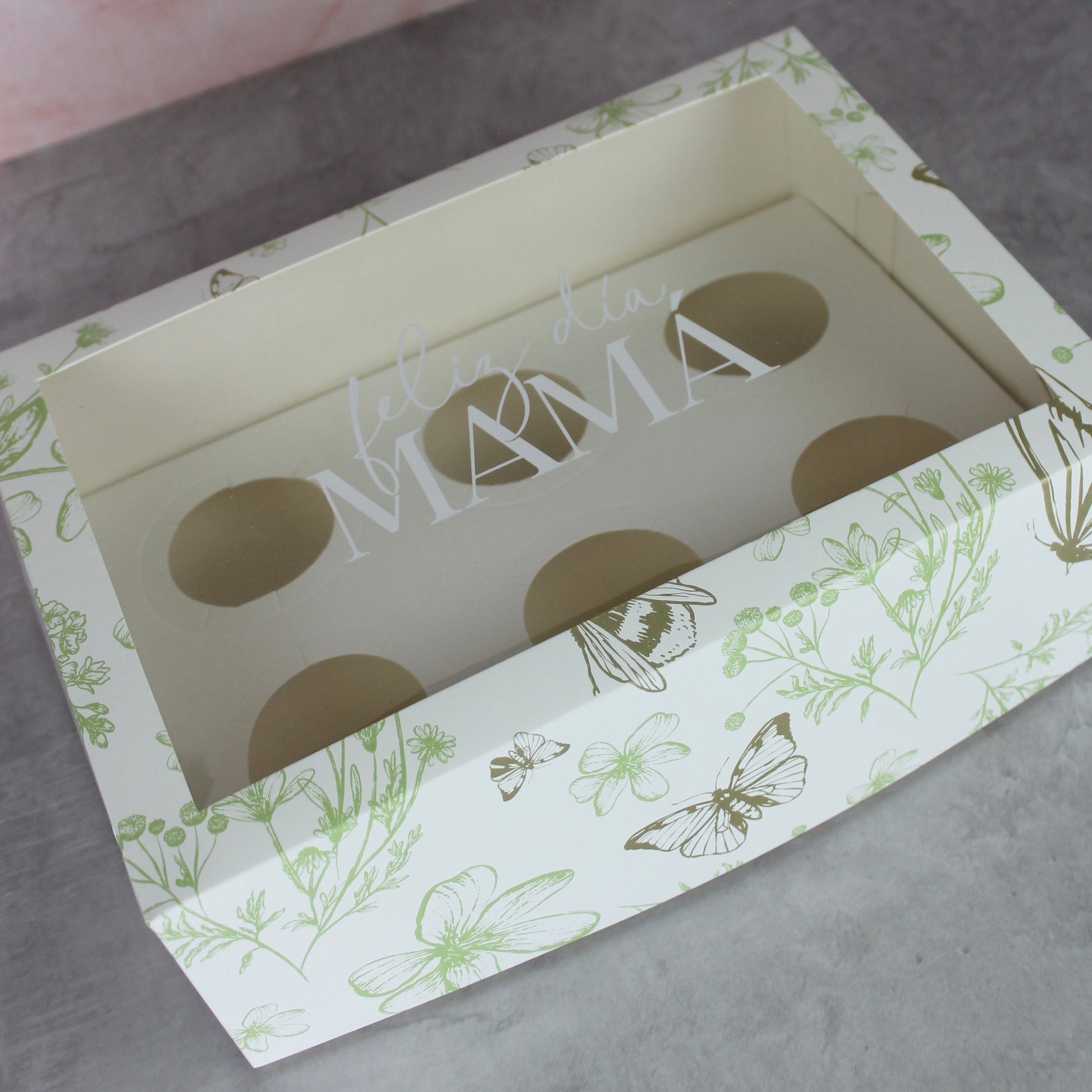 Diseño: Floral color verde con detalles de mariposas y bichitos en color dorado. Frase “Feliz día mamá” en ventana de acetato.
