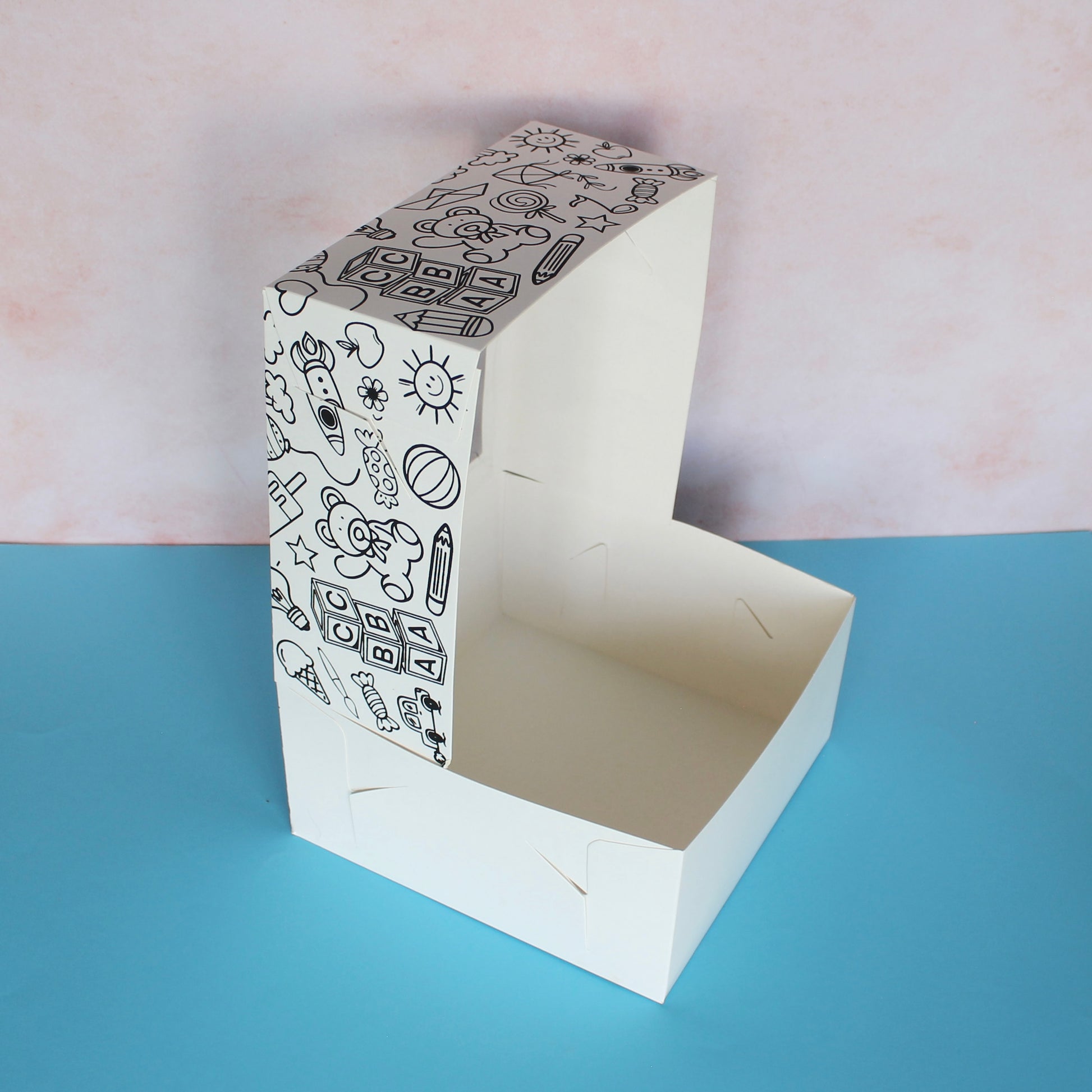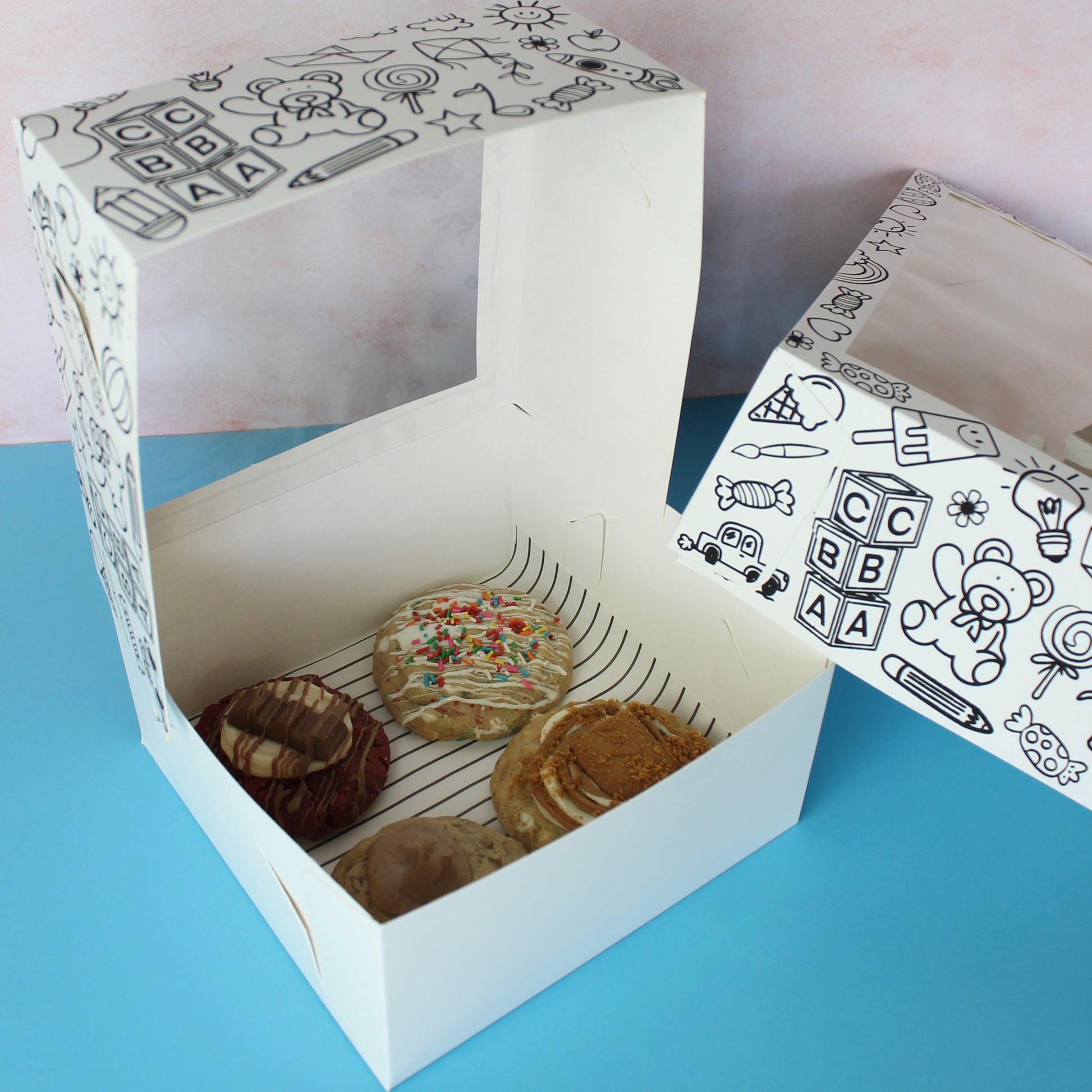 - Caja auto armable, no requiere de pegamento para su armado. Recomendada para empacar y exhibir galletas chicas, galletas estilo NY o productos de repostería, pan, conchas, croissants, también funcional para regalos de entrega personal.