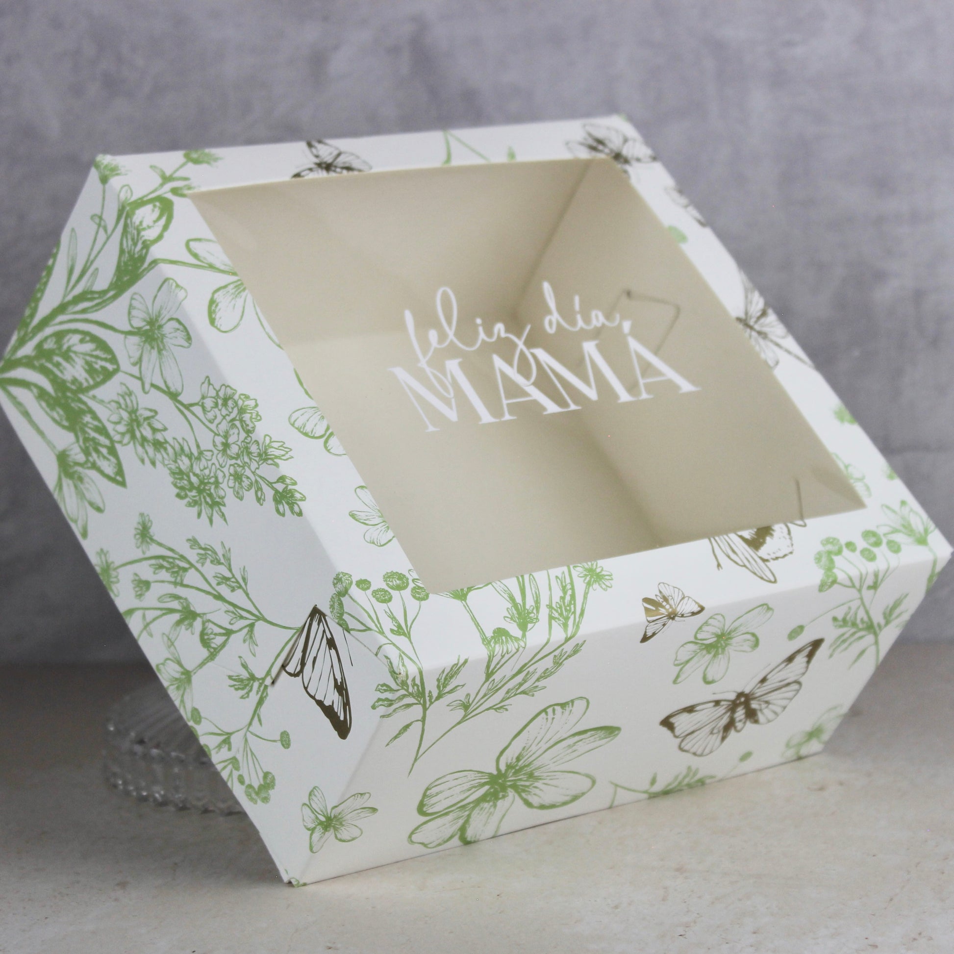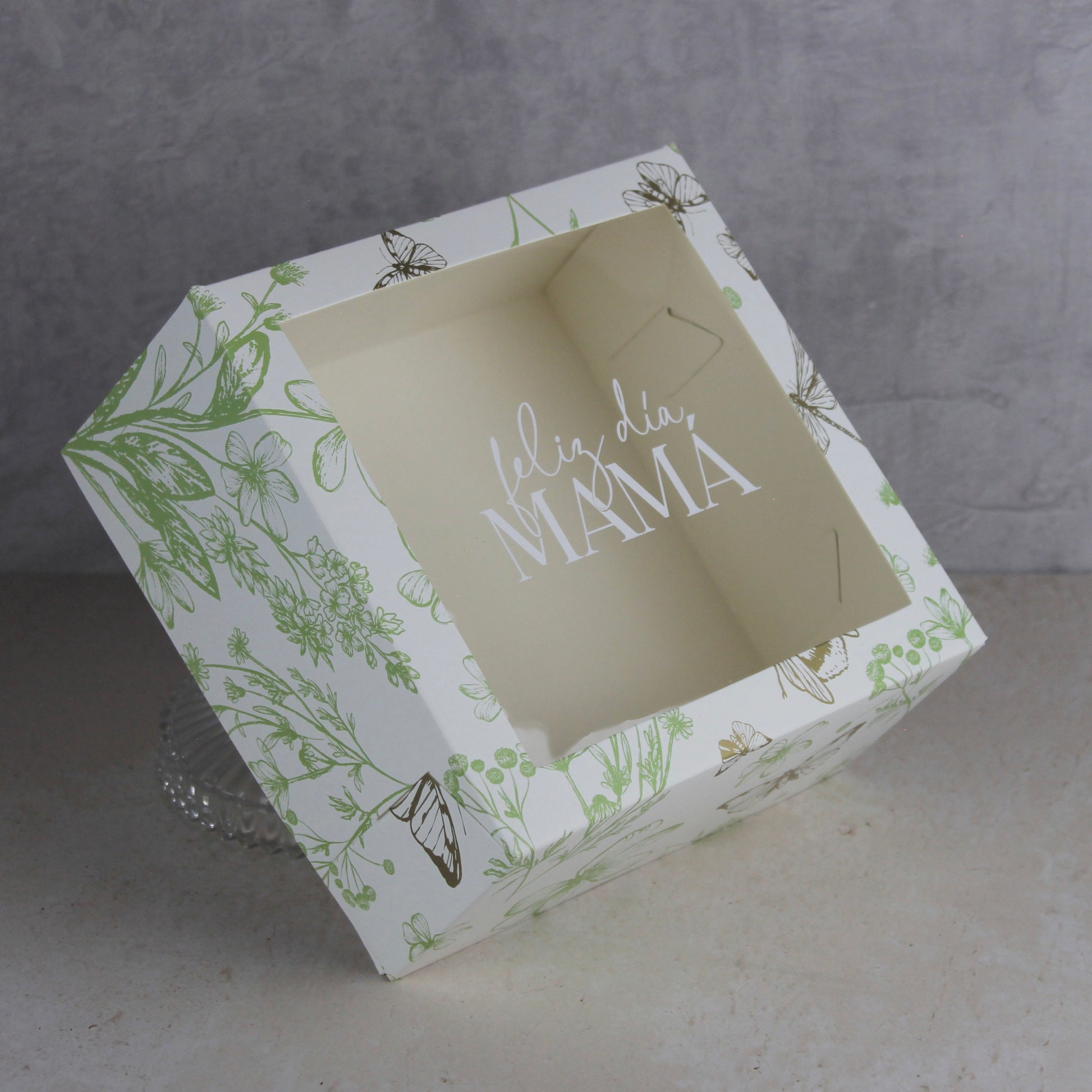 Diseño: Floral color verde con detalles de mariposas y bichitos en color dorado. Frase “Feliz día mamá” en ventana de acetato.