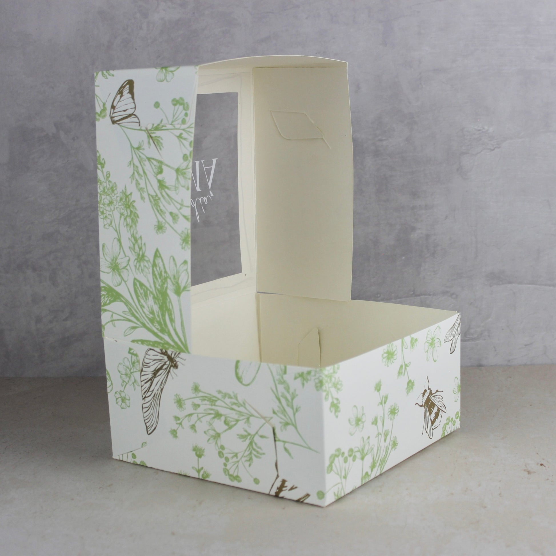 - Caja auto armable, no requiere de pegamento para su armado. Recomendada para empacar y exhibir galletas chicas, galletas estilo NY o productos de repostería, pan, conchas, croissants, también funcional para regalos de entrega personal.