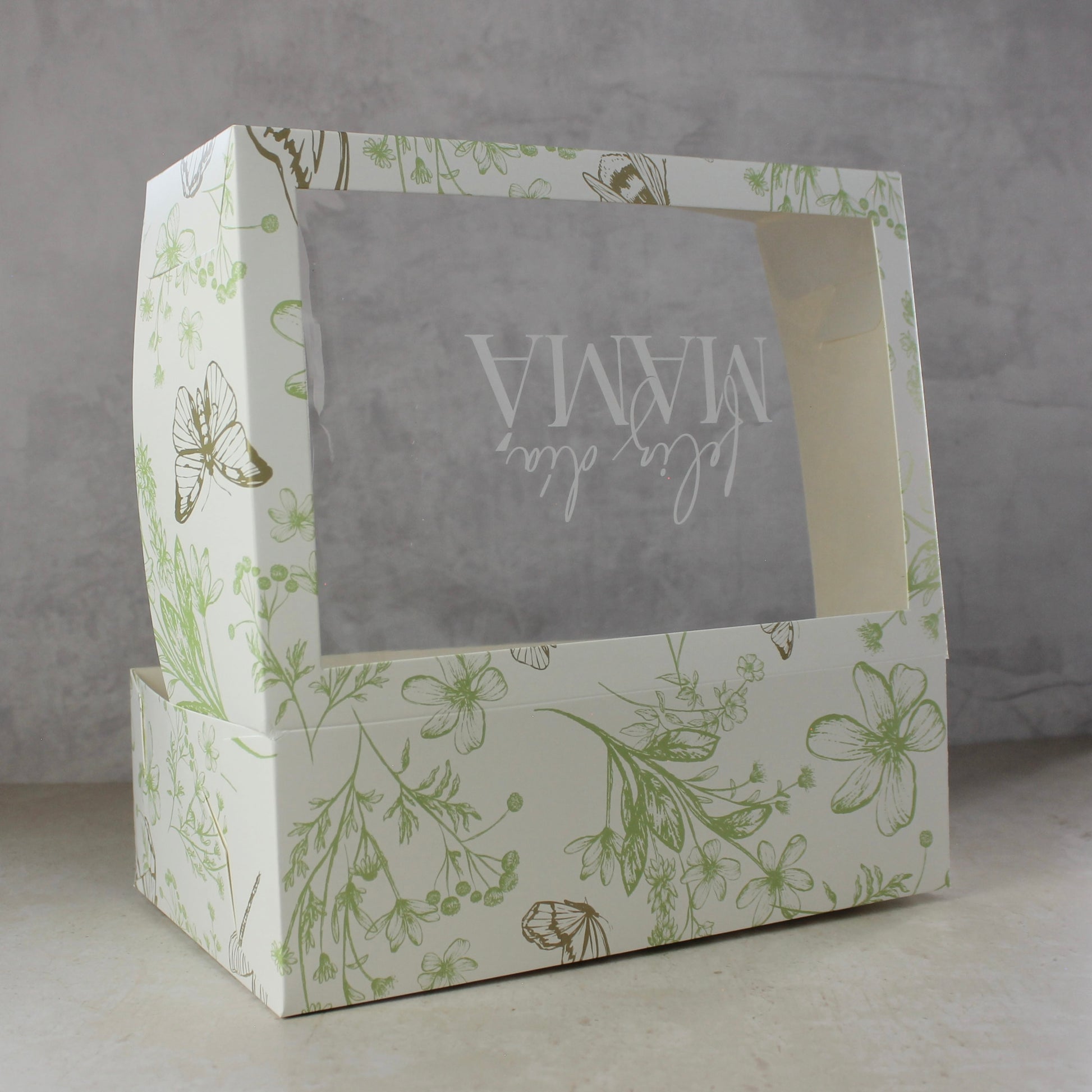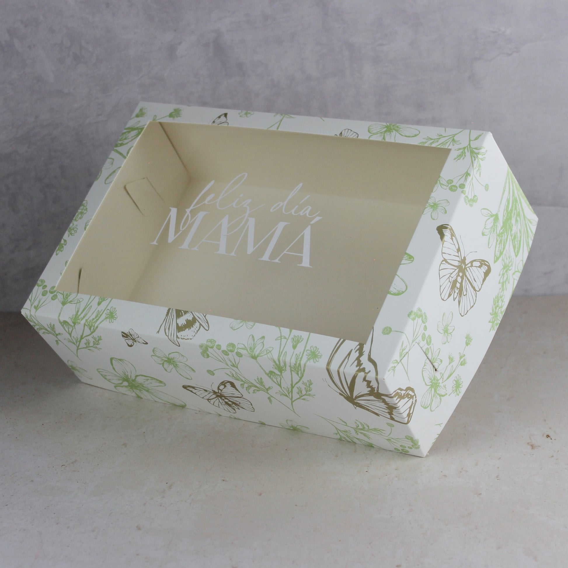 Diseño: Floral color verde con detalles de mariposas y bichitos en color dorado. Frase “Feliz día mamá” en ventana de acetato.