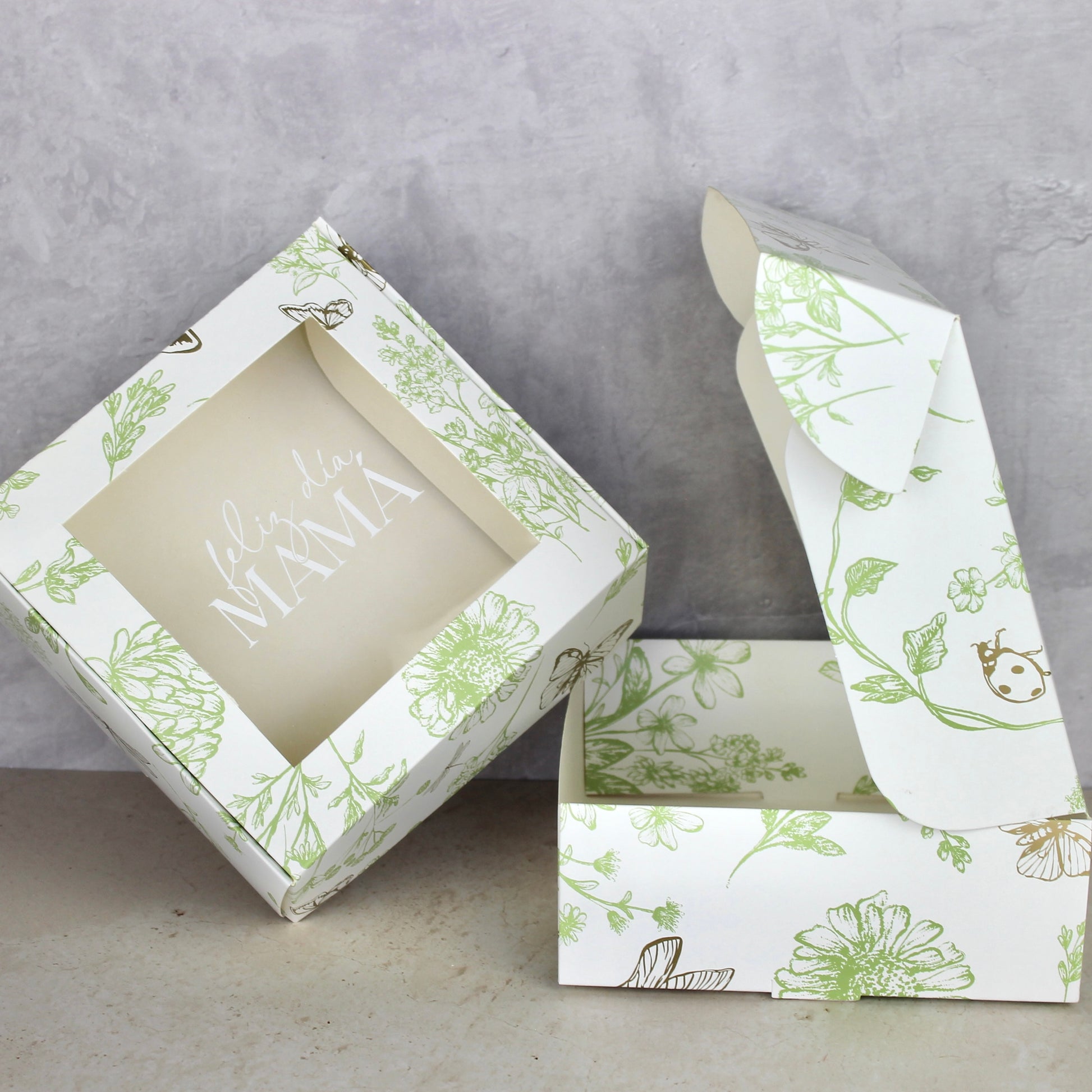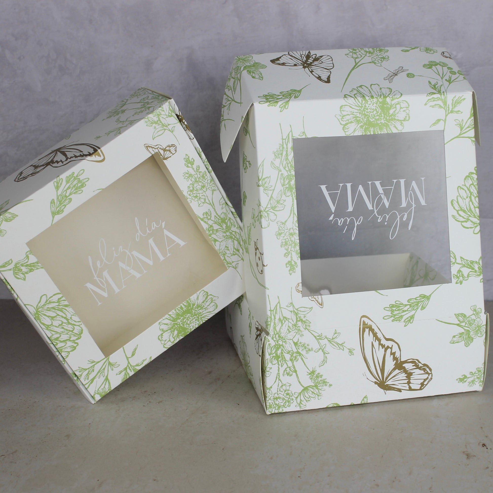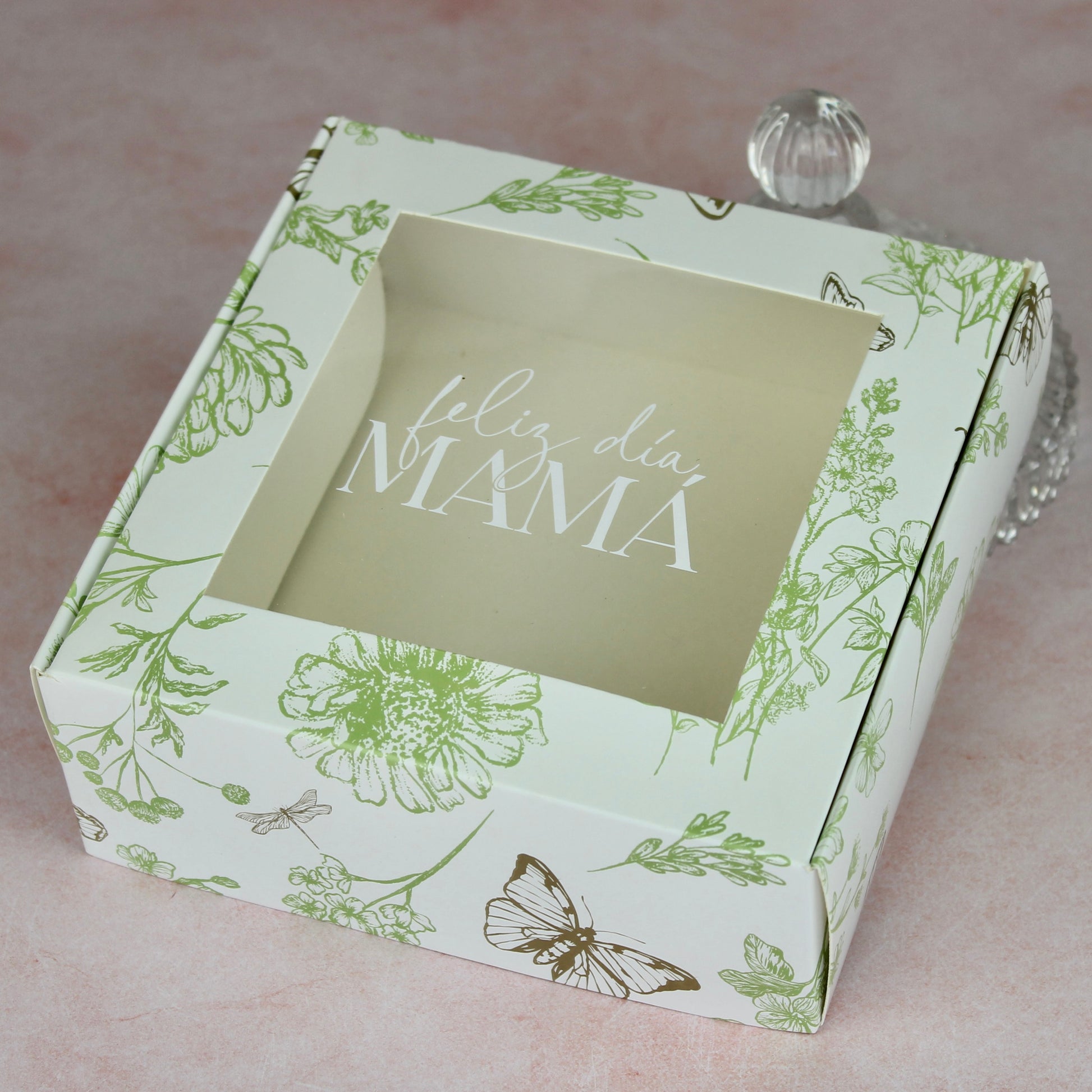 Diseño: Floral color verde con detalles de mariposas y bichitos en color dorado. Frase “Feliz día mamá” en ventana de acetato.