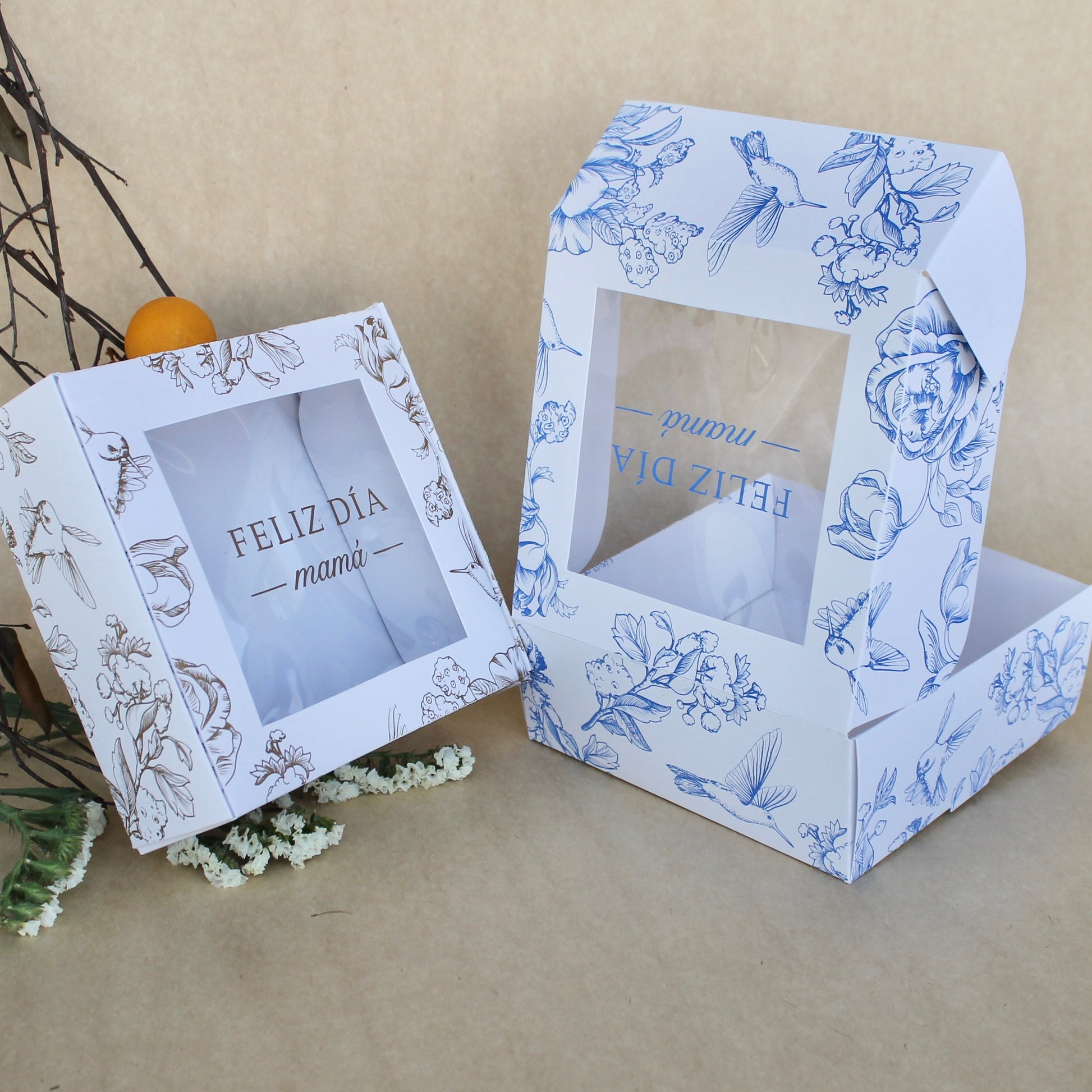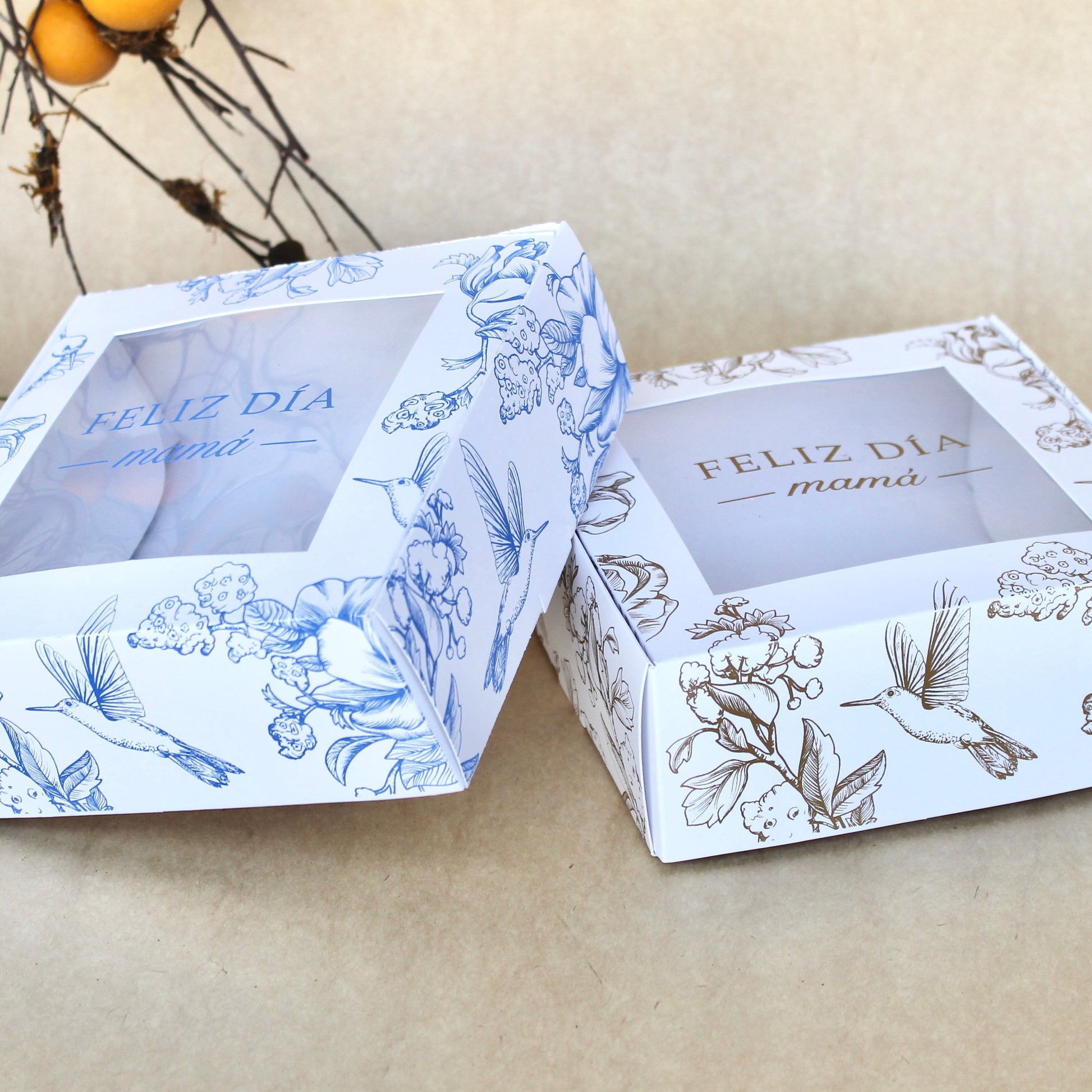 - Caja auto armable, no requiere de pegamento para su armado. Recomendada para empacar y exhibir galletas o productos de repostería, también funcional para cualquier producto (ropa, libretas, regalos) de entrega personal.