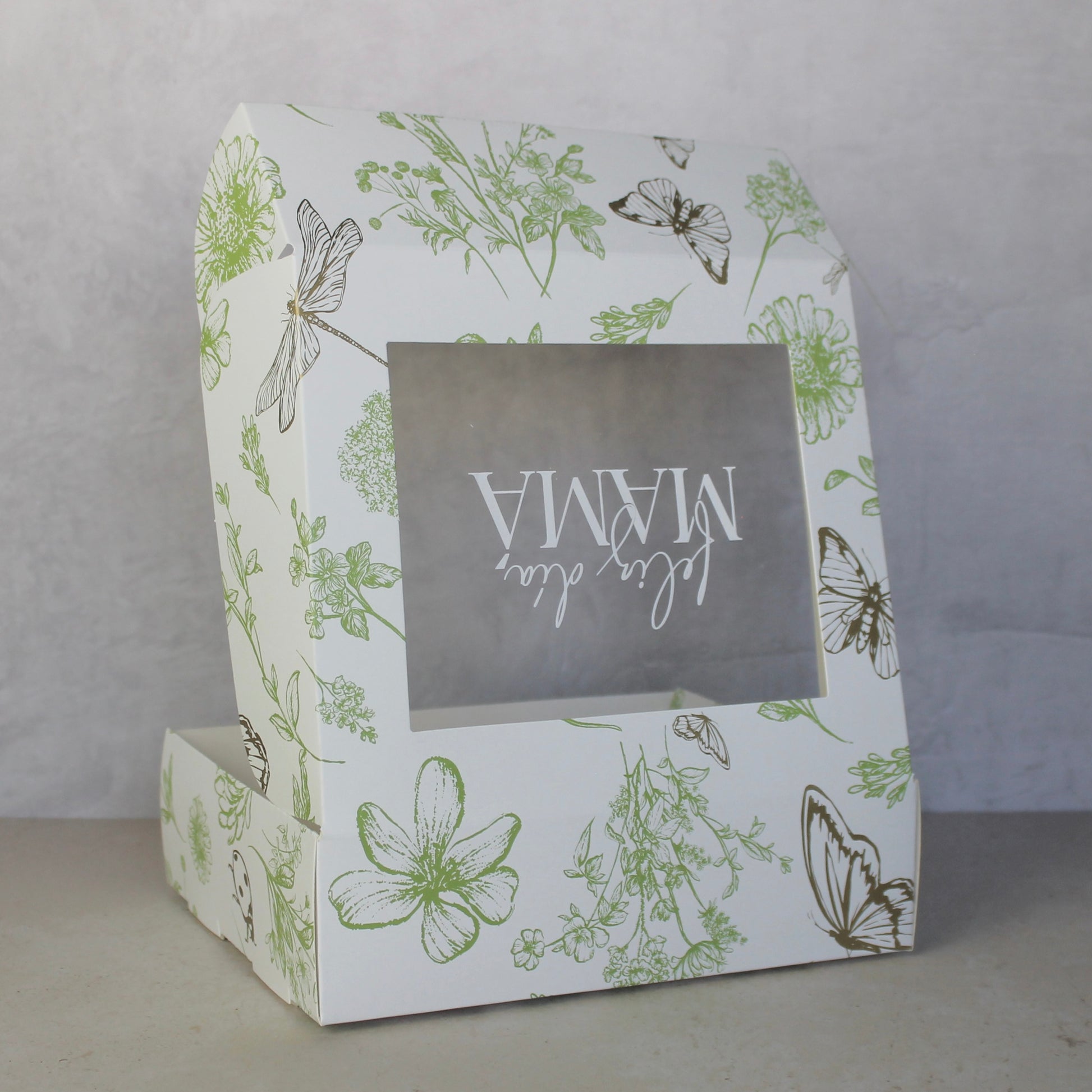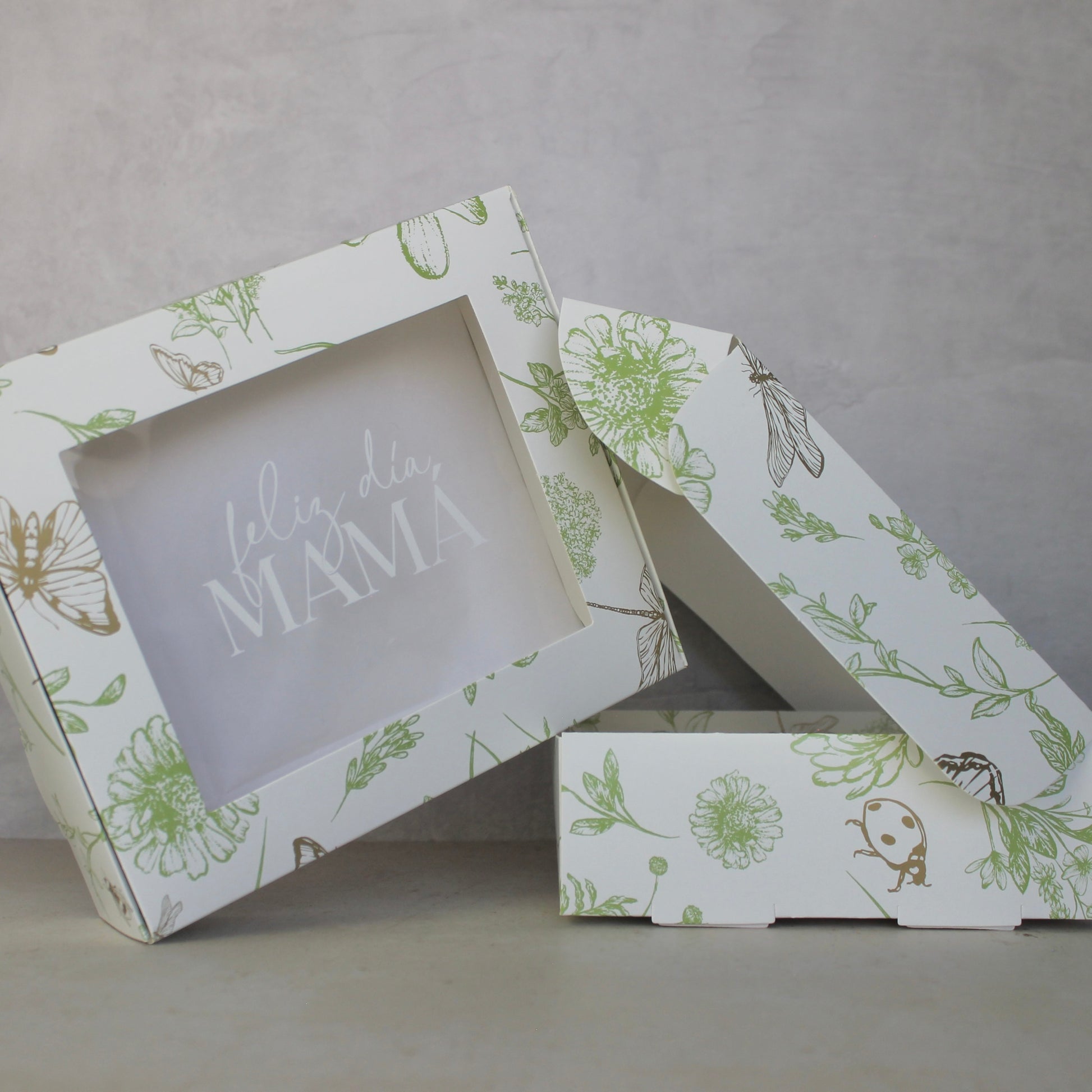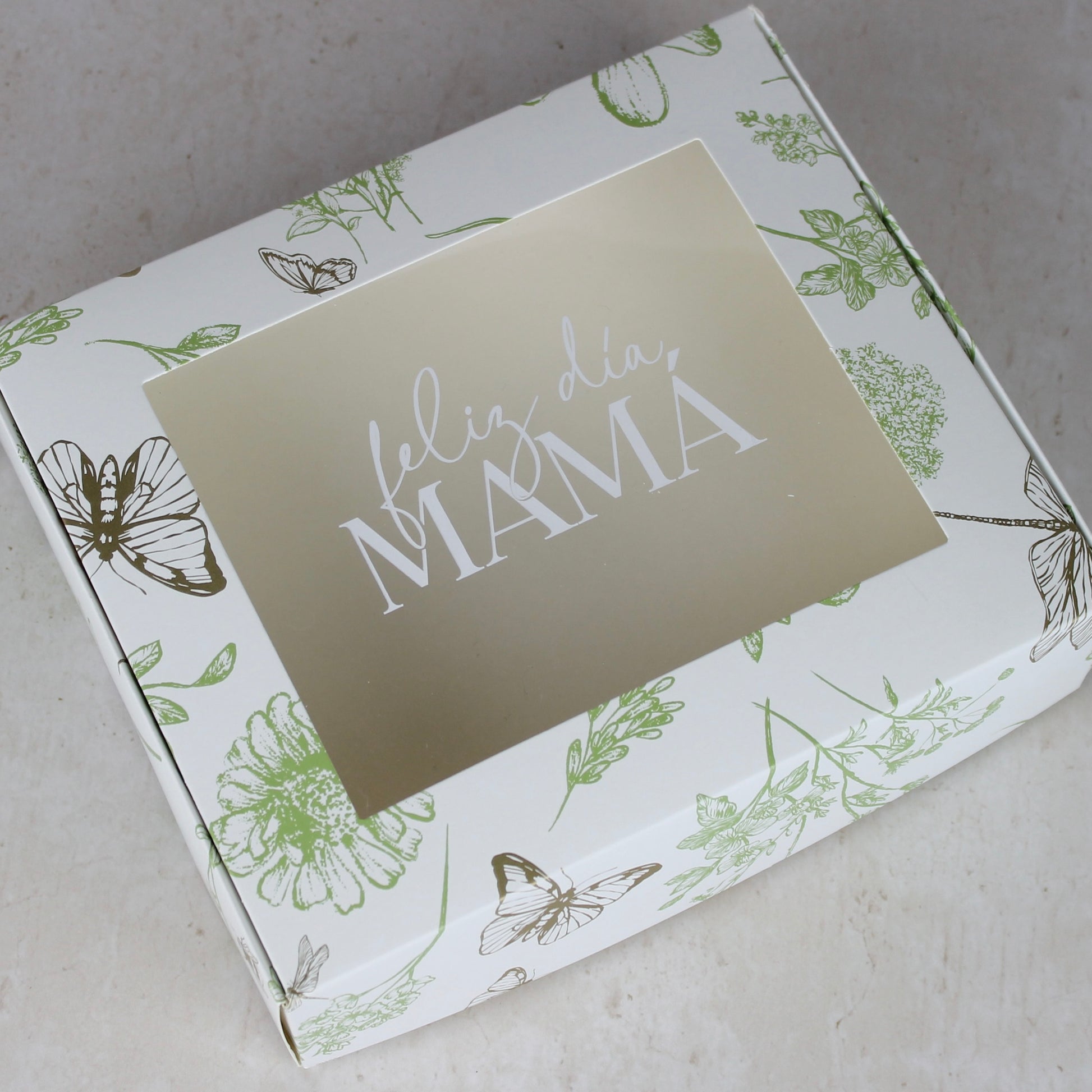 Diseño: Floral color verde con detalles de mariposas y bichitos en color dorado. Frase “Feliz día mamá” en ventana de acetato.